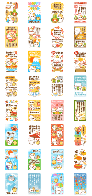 いろんなにゃんこの華やか年賀♪年末年始に役立つねこねこにゃんこのBIGスタンプです。 ※このスタンプはトークルームで大きく表示されるBIGスタンプです。ぴよたぬき♡ より発売