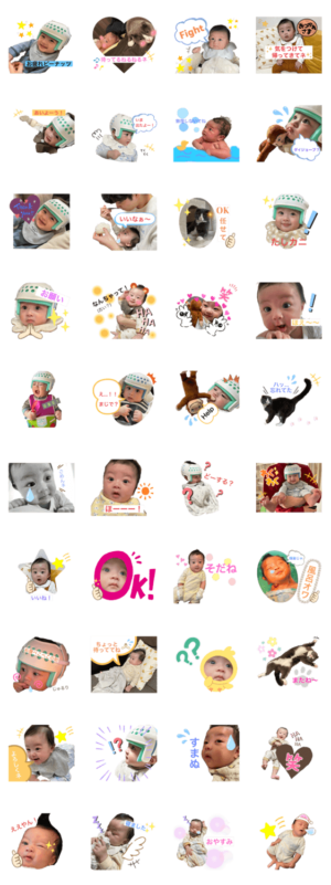 ハル(0y)とルビ(3y)のスタンプで日常会話をしてね。※ハルは頭の形を綺麗にするため、期間限定のヘルメットboyRuby より発売