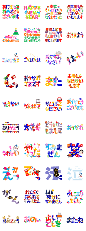 年賀やクリスマスに使えるカラフルな大きい文字のスタンプです。