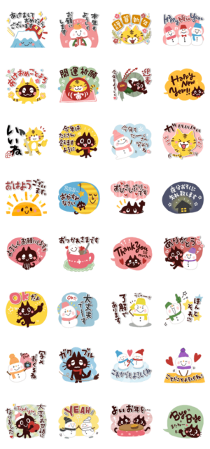 ゆるっと大人可愛い冬のスタンプ。年末年始に大活躍。あけおめ、ことよろ、お正月に。カラフルな雪だるまと黒猫にゃんこがいっぱい。今年の干支寅も!【作:キラテク】キラテク より発売