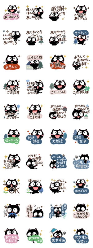 元気な黒猫スタンプ。冬の挨拶や感謝のあいさつなどたくさんしてくれます。