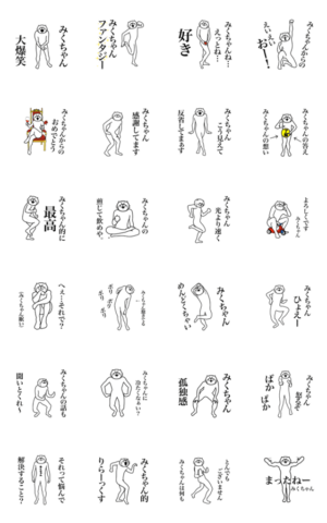 みく(みくり.みくる)ちゃんが使える面白い動く名前スタンプ♪漢字は色々…未来.美来.初音.実咲.三久.美紅.美久.美生.生来.光来.未來.未紅など世界中のミクさんに届け♪ベルだぬき より発売