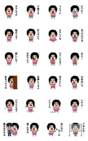 母れいこ(レイコ)からのビデオレターがディフォルメ化&おばさん化して新登場!パーマにエプロン姿の典型的なオバサンスタイル!芋ジャージの名前スタンプのくーが作