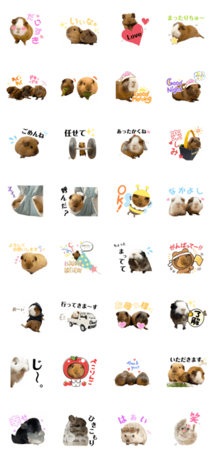 モルモットのチリ助くん、カーリーちゃんファミリーのスタンプです♪ちびっ子4兄妹とチンチラ、ハリネズミのお友達も参加しています^^ayusan より発売