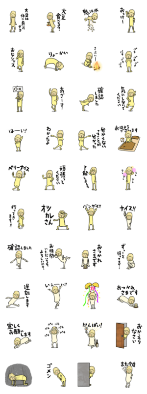 ダイズを頭にかぶった大豆おとこ。定番の使いやすい挨拶、了解、あざーす、ベリーナイス、行ってきます、おつかれさまです、バンザイ、拍手など鬼は外もあります。