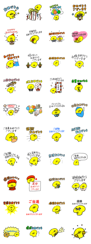 「誕生日おめでとう」や「あけましておめでとう」など色んなお祝いメッセージを伝えられるヒヨコのスタンプだよ。
