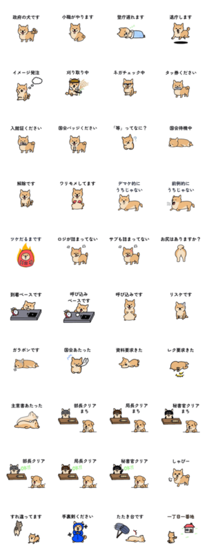 霞ヶ関ではたらく官僚(国家公務員)が日々理不尽と戦いながら使用している用語を、政府の犬が可愛く話すスタンプです。おもち より発売