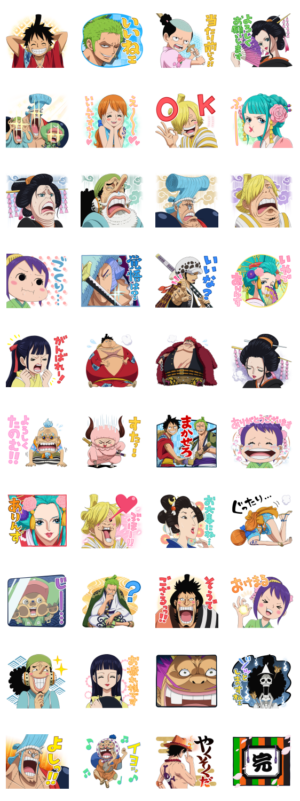 ワノ国編の描き下ろしスタンプが登場!おなじみ和装の一味たちはもちろん。モモの助らワノ国編のキャラクターもいます♪友達や家族とアツくトークで盛り上がろう!