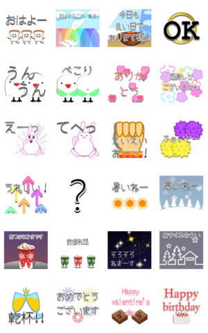 毎日使える飛び出すスタンプです。アイテムが増えたり減ったりします。バレンタインや誕生日にもご活用ください。