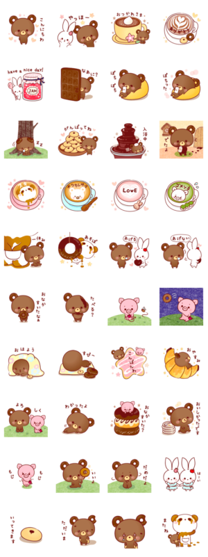 のんびりやさんのショコラくまと楽しい仲間たちの絵本のようなスタンプです。気持ちを伝える言葉や日常挨拶など大切な人に送ってね♥しらたまごはん より発売