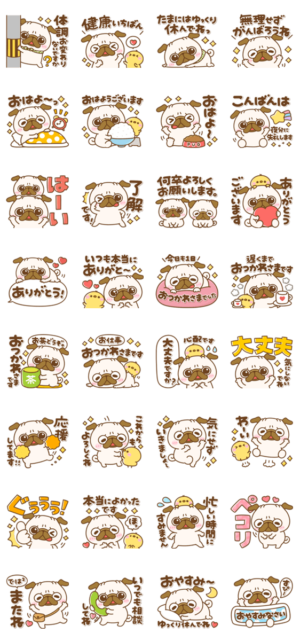 大切な人へ♡相手を思いやる気持ちを伝える言葉を詰め込んだパグちゃんスタンプです。日常で毎日使える言葉もたくさん入って幅広く使えます♪ぴよたぬき♡ より発売