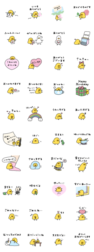 ヘンテコなひよこの気持ちを伝えるスタンプだよ! アヒルもちょっとだけ登場! 好きな人たちにたくさん送ってね☺︎bocunoe より発売