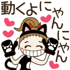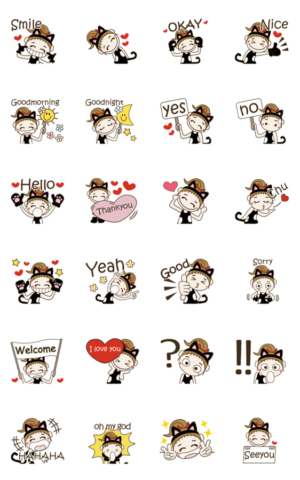 大人女子、元気なポニーテールの女の子、おちゃめの 動く黒猫スタンプです。おちゃめ より発売