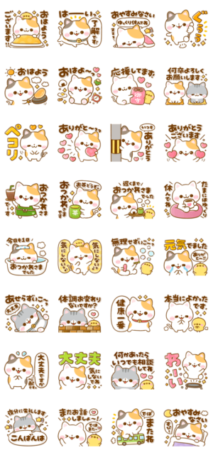 いろんなにゃんこが気持ちを伝える♡毎日使える言葉から相手を思いやる言葉までいろいろと入ったスタンプセットです♡ぴよたぬき♡ より発売