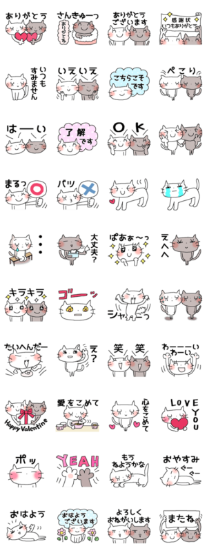 猫のしろちゃんとくろちゃんの日常、気持ちが伝わる優しくて温かい40個。文字が大きくて見やすい、サクっと送れるスタンプです。バレンタインデーにも便利です。