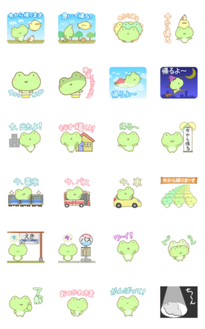 かえるの帰るコールのアニメーションスタンプ。サラリーマン、学生さんへ!今から帰る等、家に帰る時に家族に送る帰宅連絡に使える。お疲れ様等のお返事のおまけ付き!studio ケロ より発売