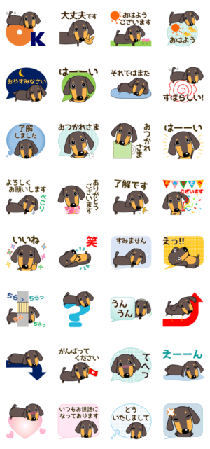 字がはっきりしていて見やすく、敬語で使いやすい言葉を集ました。ダックスフンド、犬好きの方へ。ゆるいスタンプ。ありがとう、おはよう、おつかれさま、了解、おやすみ等