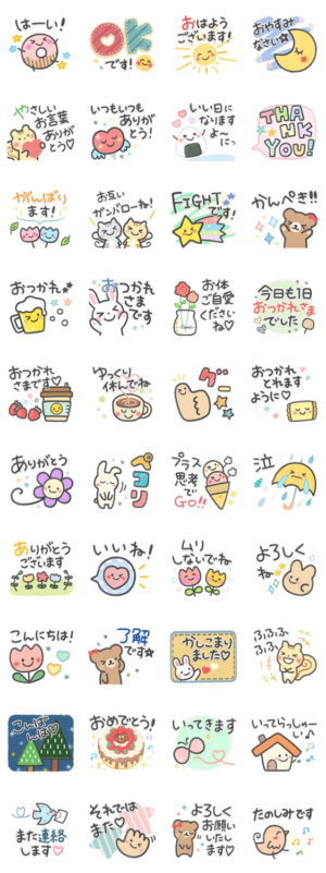 ふんわりとした絵柄で見やすく人を選ばずやさしく使えるスタンプの第5弾!気遣いの言葉,あいさつ,返信などの日常的な言葉を敬語を含め収録した毎日使いやすいセットです♪