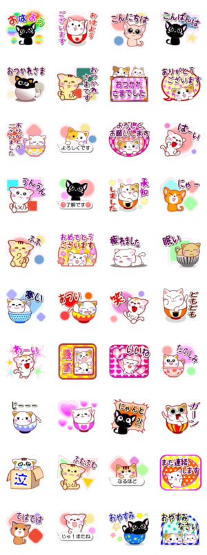 かわいい癒しの子猫たち、おはようからおやすみ、お疲れ様、ありがとう、感謝喜怒哀楽、よく使う日常会話で毎日使えるいろんなネコをミックスしたスタンプ集です