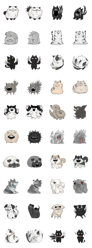 身近にいそう、でもどこか不思議でちょっぴり不気味な犬と猫のスタンプです。ゆ菓子 より発売