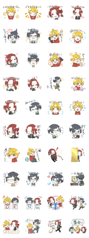 【架空の】人気ゲーム実況者、チーム枯渇のスタンプです。 ミル(黄)、さき(赤)、志樹(青)の三人組です。しきいろ より発売