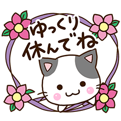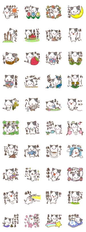 くろぶちネコと春の花のあいさつスタンプです。「おはよう」から、「ありがとう」「おつかれ」「おやすみ」等を含めた猫スタンプ。ブチねこ好きな方へ。【かたこ】かたこ より発売