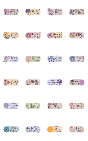 手描きの優しいお花達を動くスタンプにしました。敬語をたくさん詰め込んだ大人の女性が使いやすいスタンプです。