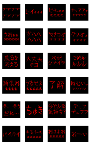 怖そうで怖くない内容を収録。適当なリアクションに使えるスタンプです。怖い/ドッキリ/メンヘラ/日常/便利/今どんな気持ち?/煽り/強調/変人/恐怖/面白い/シュール/ホラー