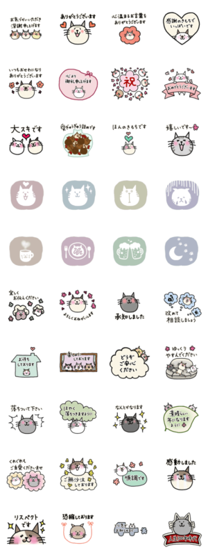 丁寧な敬語だけど堅苦しくない。手書きねこの盛り合わせです。 くすみカラーで使いやすい、文字なしスタンプ8個入り。さよはや より発売