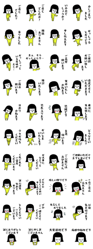 毎日頑張って働く女性の為のビジネスシーンや職場の人へ使える敬語のスタンプ。黄色全身タイツのちょいシュールOLがとても丁寧な敬語で真面目にメッセージをお届けします。