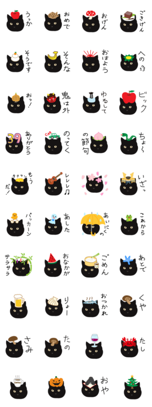 のら猫出身のクロネコが、かぶりモノでくりひろげる、ダジャレあり、季節の節句ありの楽しいスタンプ。サジーグラフィックス より発売