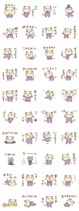 ネコのドラプル。ガタイがいい紫色のネコ。「ファイトでーす」「ペコリ」から「たのむよ」まで。ネコのドラプルで、ユーモラスにメッセージを届けよう。Mami / エストループ より発売