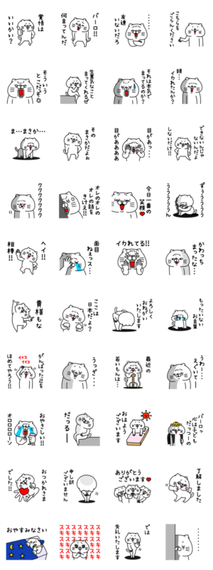 全力でうざい全力でおちょくるあざとかわいい猫がただひたすらにバーロー、イカれてる、えぐいなど使えるちょいダサいセリフを言うだけのスタンプ。cosotto より発売