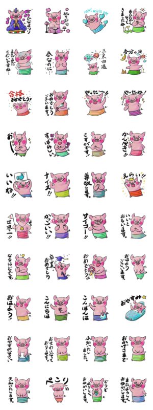 豆金豚牧場のキャラクター、ブタのポーくんのオリジナルスタンプ第6弾です。3月の季節のイベントや相手を称賛する気持ちを表現したスタンプをメインに描きました。