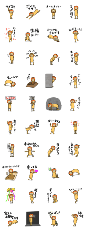 定番の挨拶の返事・返答のナイス、ペコリ、了解、おつかれさまです、おなシャス、ヨロシク、おはようございます。感謝、お祝い、待機、喜び、など感情表現たっぷりです。
