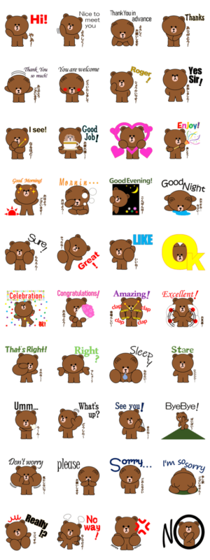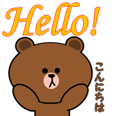 ブラウンの英語(日本語あり)仕様のスタンプです。毎日使えるフレーズになっています。