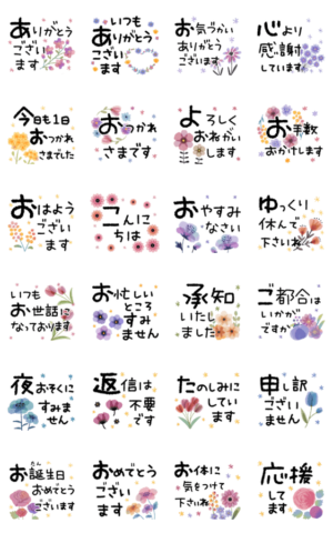 大人の女性が使いやすい丁寧な敬語のスタンプをつくりました。可憐なお花たちがきれいにメッセージを彩る上品なスタンプです。