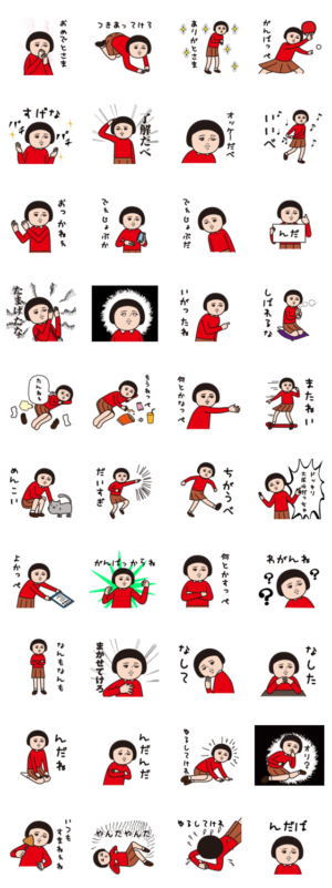 パッと見ダサいけど、昭和味があってかわいいスタンプ(東北特別編2)いつもの芋ジャージを着替えて東北弁しゃべってます。第2弾は動かないスタンプです