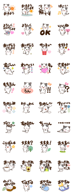 くろぶちネコの冬のあいさつスタンプです。「おはよう」から、「ありがとう」「おつかれ」「おやすみ」等を含めた毎日使える猫スタンプ。ブチねこ好きな方へ。【かたこ】かたこ より発売