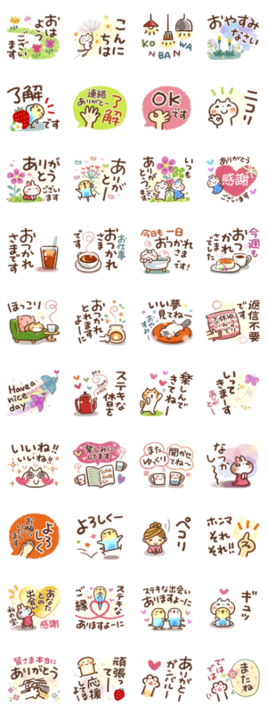 ほんわかしたイラストと淡い色使いが可愛くて気に入っています。うさぎなど日常的なキャラクターが描かれていて、スタンプのあいさつや言葉も日常的なものなので相手を選ぶことなく使いやすいです。