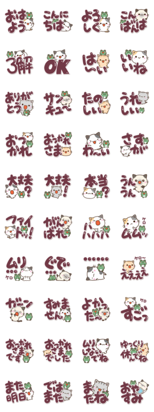 『ちびミケ』の三毛猫や、『ちびシャム』のシャムネコたちと、小さなカエルのコラボスタンプです。大きな文字で選びやすいです。ねこや蛙キャラ好きな方にぜひ。【かたこ】