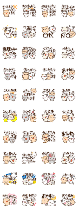 『ちびミケ』の三毛猫や、『ちびシャム』のシャムネコ、『ちびブチ』のぶち猫、アメショ等の猫が登場する、相手を思いやるネコスタンプ。ねこ好きの方にぜひ。【かたこ】かたこ より発売