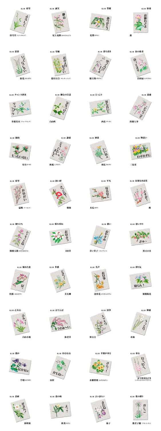 花言葉を普段使いの言の葉に置き換えて、気持ち伝わる草花の絵手紙が舞い込みます。 ※このスタンプはトークルームで大きく表示されるBIGスタンプです。Kyan より発売