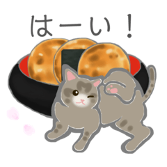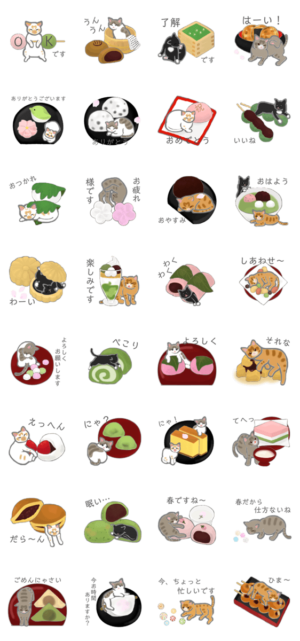 近所に住むノラ猫ちゃんたちをスタンプにしました。和菓子・和スイーツに囲まれたネコちゃんたちのスタンプです。春らしいお菓子多めです。かぎしっぽ より発売