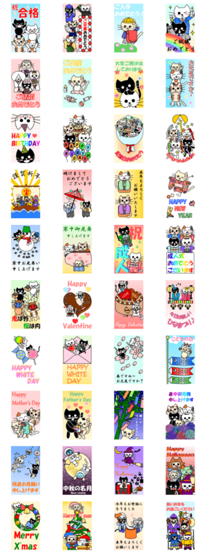 白猫たまと黒猫クロと仲間達が、年末年始、卒業、入学、記念日、誕生日、バレンタイン、ホワイトデー、クリスマス、ハロウィン...全部祝います。春夏秋冬使えますよ。