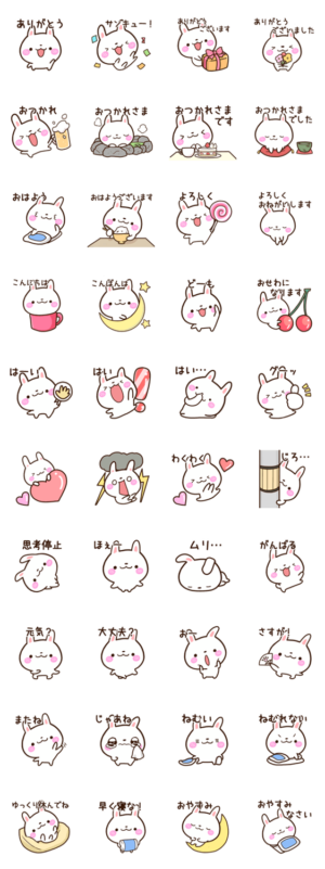 ちいさくて、まるいうさぎのスタンプ。かわいい返事や、ていねいな言葉、いろんな表情の便利なスタンプです。うさぎのキャラクターが好きな方にぜひ。【かたこ】かたこ より発売