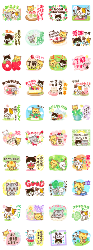 さわやかな春夏にぴったり♡敬語.あいさつ.お祝い(卒業入学・誕生日おめでとう)♡三毛猫.ハチワレ猫.トラネコ.シロネコ…幸運クローバー.お花.いちごで毎日明るくHAPPY♪