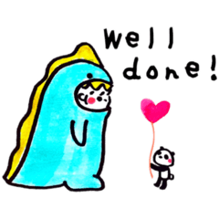 恐竜のきぐるみをかぶった女の子、第5弾!今回は英語スタンプです。パンダさんが友情出演しています。Have a nice day!!