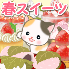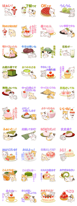 可愛い赤ちゃん猫たちに、桜餅・草餅・柏餅・イチゴパフェ・抹茶ケーキ・チェリータルト・サクランボムース等の春のスイーツを添えて。毎日使う大きめ文字のスタンプです。
