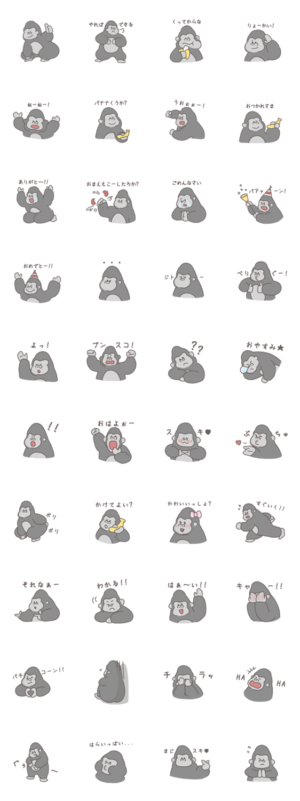 ゴリラの表情が豊かで、ちょっと面白味があります。仲の良い友人に送りたいスタンプです。